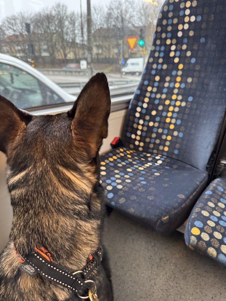 I onsdags fick Asti följa med och hämta bilen som var på service. Åka kommunalt med buss var första gången. Var lite svårt att sitta still i början för det var väldigt nyfiket och kolla allt. Tog ca 45 min med bussen, en kort promenad och sen in på Hedin bil i Segeltorp. Var hur cool som helst inne på bilfirman.